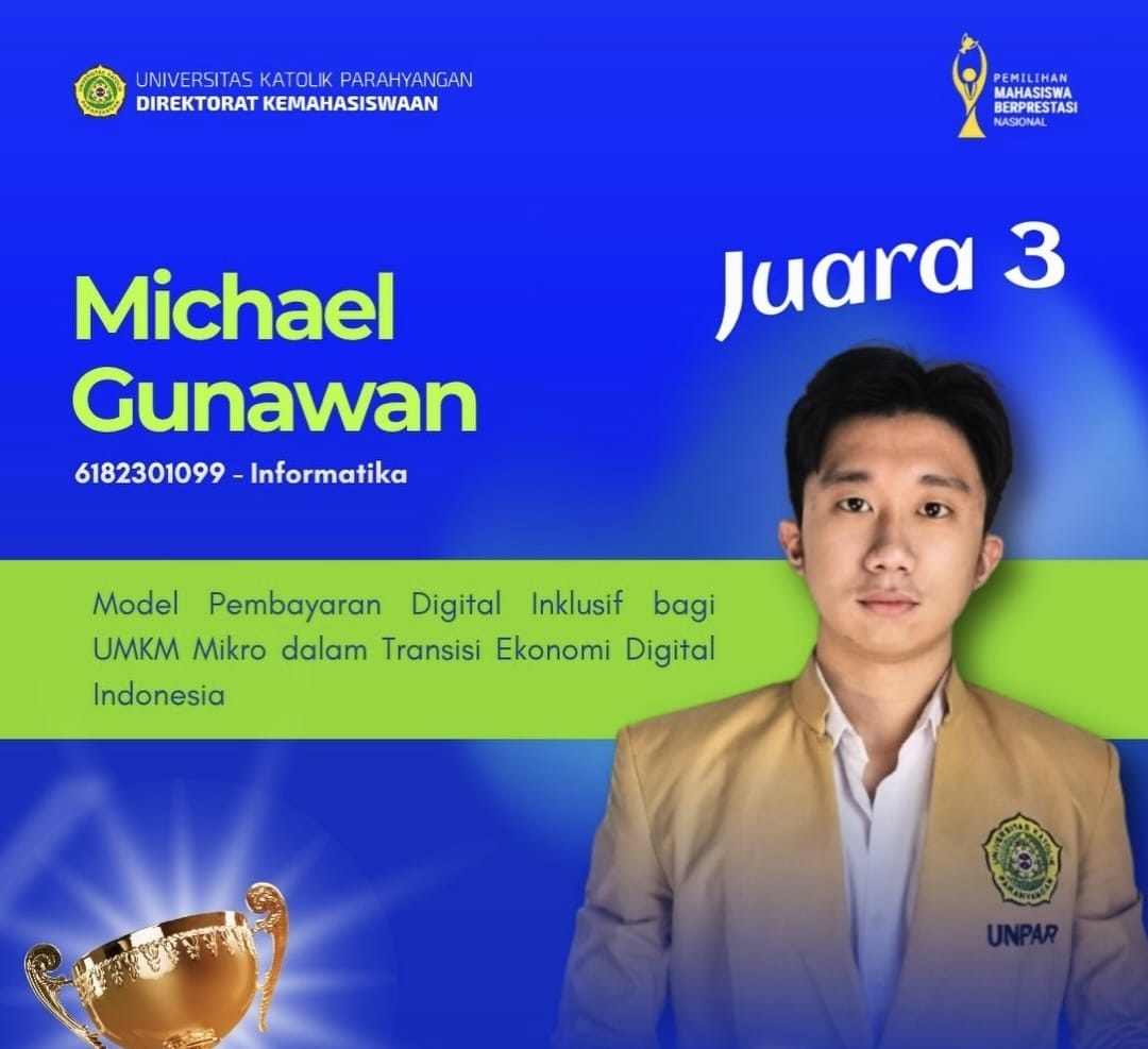 Michael Gunawan, mahasiswa Informatika angkatan 2023, sukses menorehkan prestasi sebagai Juara 3 dalam ajang Pemilihan Mahasiswa Berprestasi (Pilmapres) UNPAR tahun 2026. Selama dua bulan intensif, Michael mengembangkan ide hingga menyusun presentasi di bawah bimbingan Pak Keenan, yang berperan penting dalam mempertajam struktur serta relevansi gagasan. Inovasi ini lahir dari keprihatinan Michael terhadap kesenjangan digital yang dialami UMKM tradisional dan lansia. Di tengah masifnya sistem non-tunai, banyak pedagang kecil justru terancam kehilangan potensi pendapatan dan semakin tertinggal karena keterbatasan perangkat, rendahnya literasi teknologi, serta tingginya rasa takut terhadap risiko penipuan digital.
