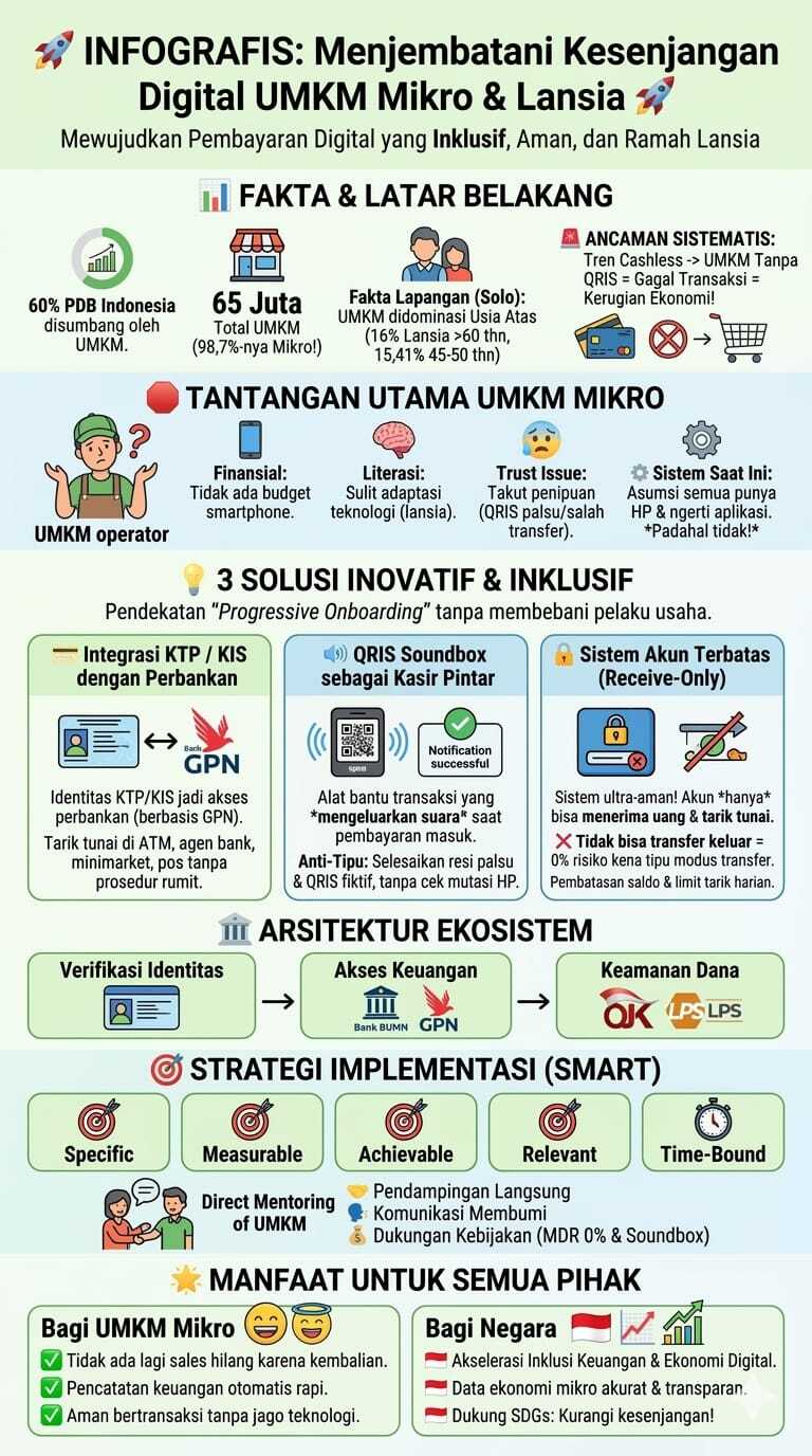 Sebagai solusi, Michael mengusulkan model pembayaran digital inklusif yang tidak lagi bergantung pada kepemilikan smartphone. Sistem ini mengintegrasikan identitas nasional seperti KTP dengan akses perbankan sederhana, serta memanfaatkan QRIS soundbox untuk memberikan notifikasi transaksi berbasis suara secara real-time. Guna meningkatkan faktor keamanan bagi pengguna awam, Michael juga menyertakan fitur akun terbatas (receive-only) yang hanya bisa menerima pembayaran dan tarik tunai. Terobosan ini diharapkan mampu meruntuhkan hambatan teknologi, sehingga pelaku usaha yang paling konvensional sekalipun dapat ikut merasakan manfaat dari ekosistem ekonomi digital yang aman dan praktis.